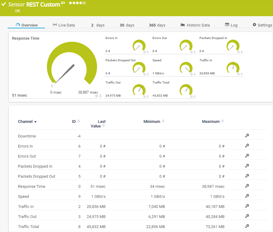 The REST Custom sensor queries a Representational State Transfer (REST) application programming interface (API) endpoint and maps the JavaScript Object Notation (JSON) or Extensible Markup Language (XML) result to sensor values.