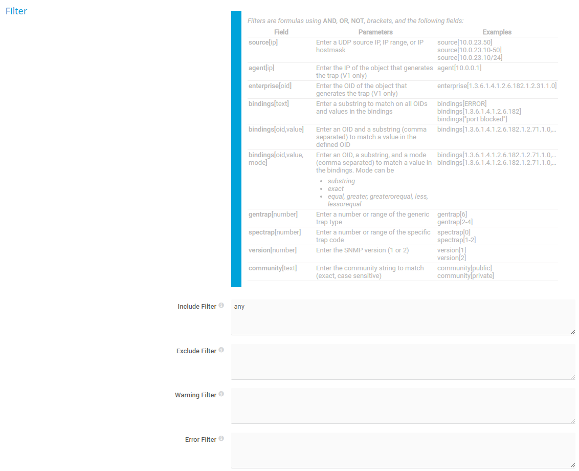 You can use include and exclude filters to define which traps to monitor or use warning and error filters to define how to categorize received traps. Provide these filters in the sensor settings as formulas. Formulas are fields that you can combine with boolean operators (AND, OR, NOT) and brackets.